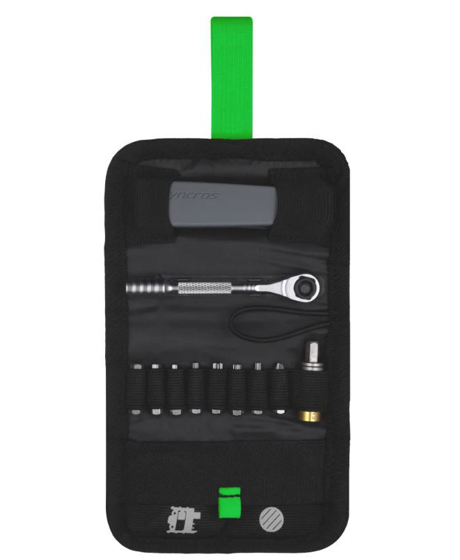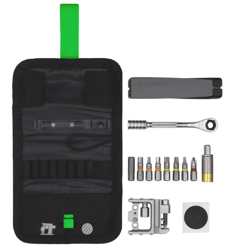 Im Syncros Guide Kombiwerkzeug-Kit findest Du einen Ratschendreher mit 9 Aufsätzen und 5 Nm Drehmoment-Begrenzer, Kettenwerkzeug, Reifenheber, ein klebstofffreies Flickset und einen Schlüsselanhänger. Da Du die praktische Wickeltasche verschließen kannst, sind alle Werkzeuge sicher untergebracht.
