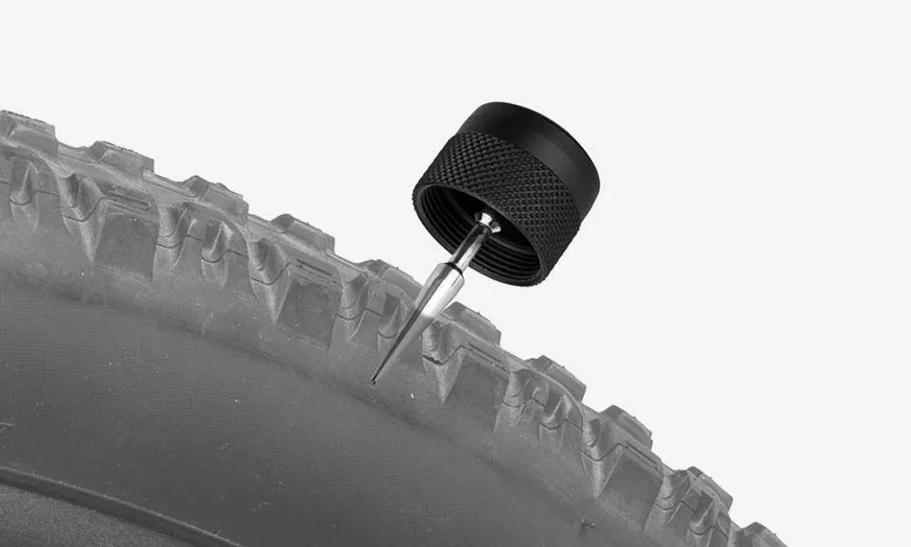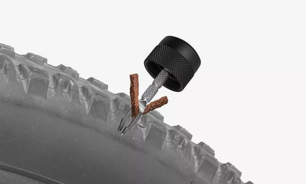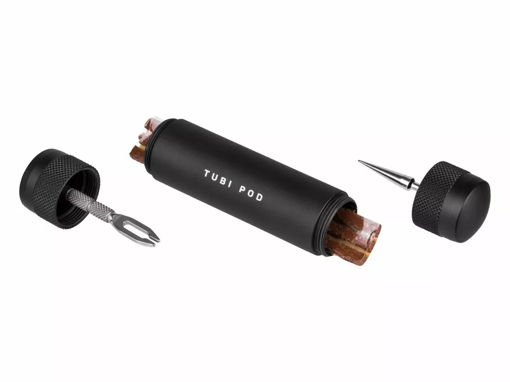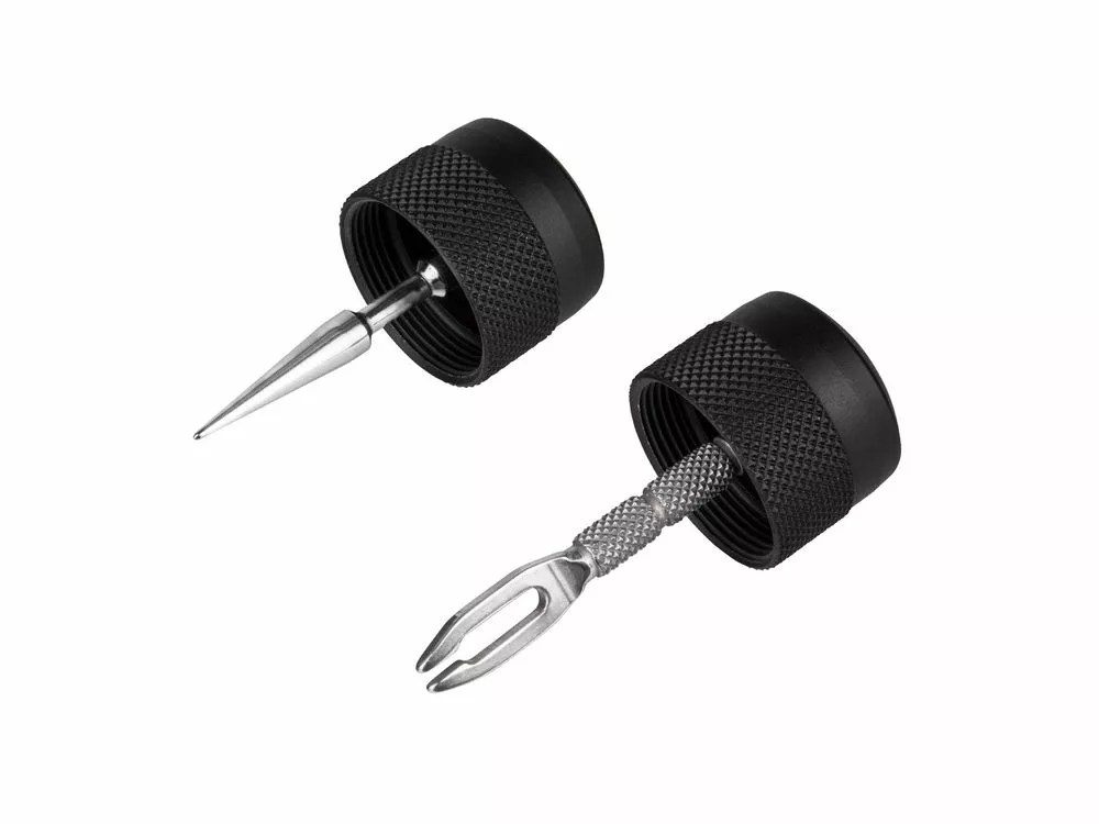 Das Tubeless-Reparaturset der Minimalisten. Enthält einen Air-Stop, Plug-Einstecher, Aufreiber und drei 3,5 mm dicke Plugs, die in einem Transportfach gelagert sind. Die Tubeless-Tools sind in den Endkappen integriert, wobei die profilierte Oberfläche für maximalen Grip während der Reifenreparatur sorgt.